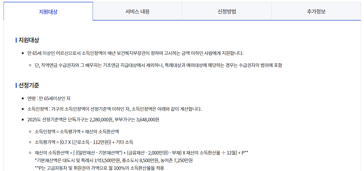 - 대상: 만 65세 이상 대한민국 국적을 가지고 국내 거주하는 어르신 (소득 및 재산 기준 충족 시)